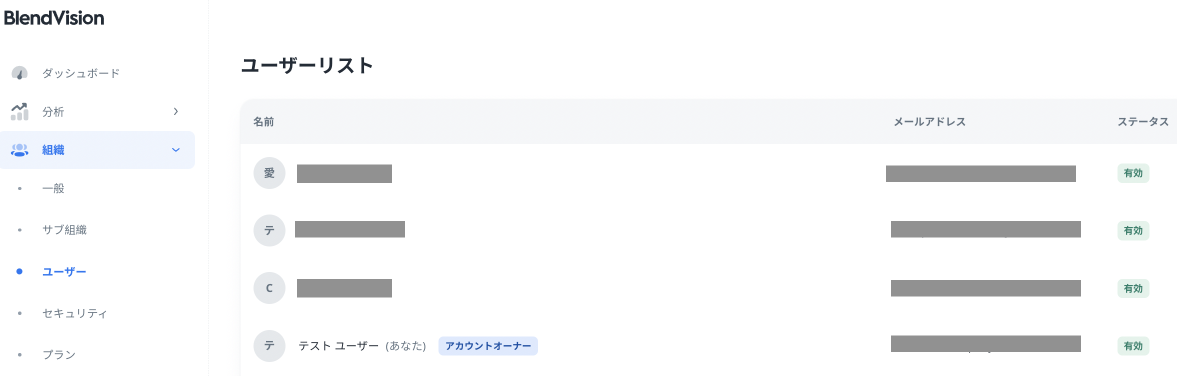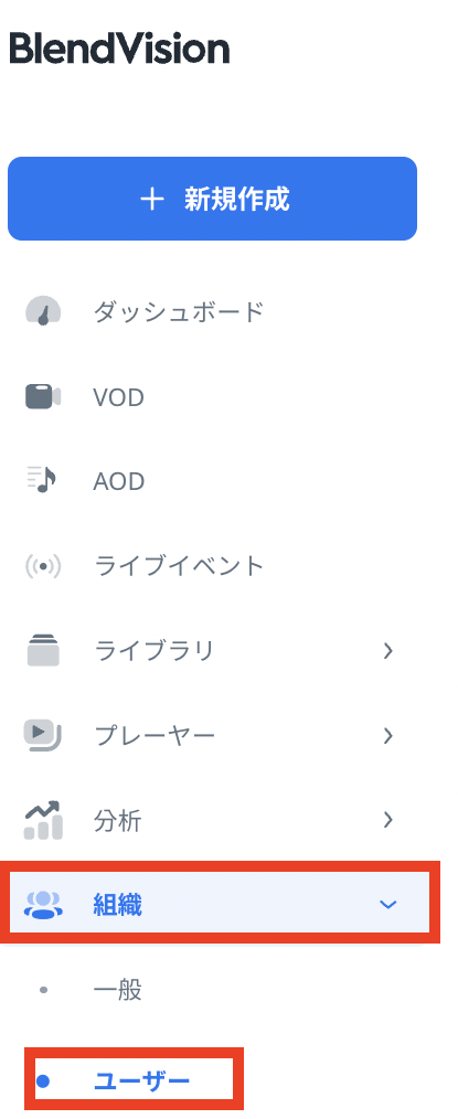 BlendVisionは、組織内の複数のユーザーとその権限を管理するための組織メニューを提供しています。