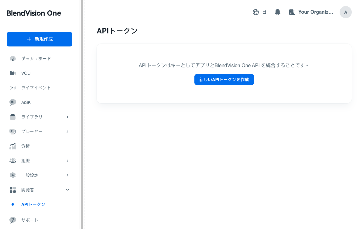 BlendVisionウェブコンソールにログインし、サイドメニューの「開発者」>「APIトークン」に移動します。