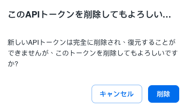 確認のためのポップアップウィンドウが表示されます。「削除」ボタンをクリックすると、削除したいAPIトークンが完全に削除されます。