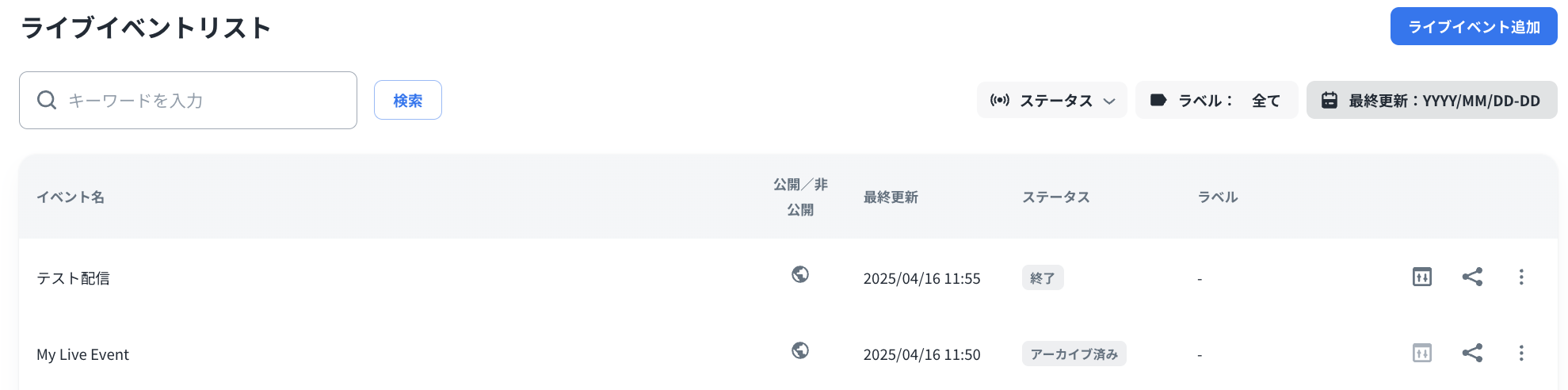 ライブイベントリストのページ表示の優先順位は、更新時間の新しい順となっています。そのため、ライブイベントが再利用されると、ライブイベントリストの一番上に移動します。