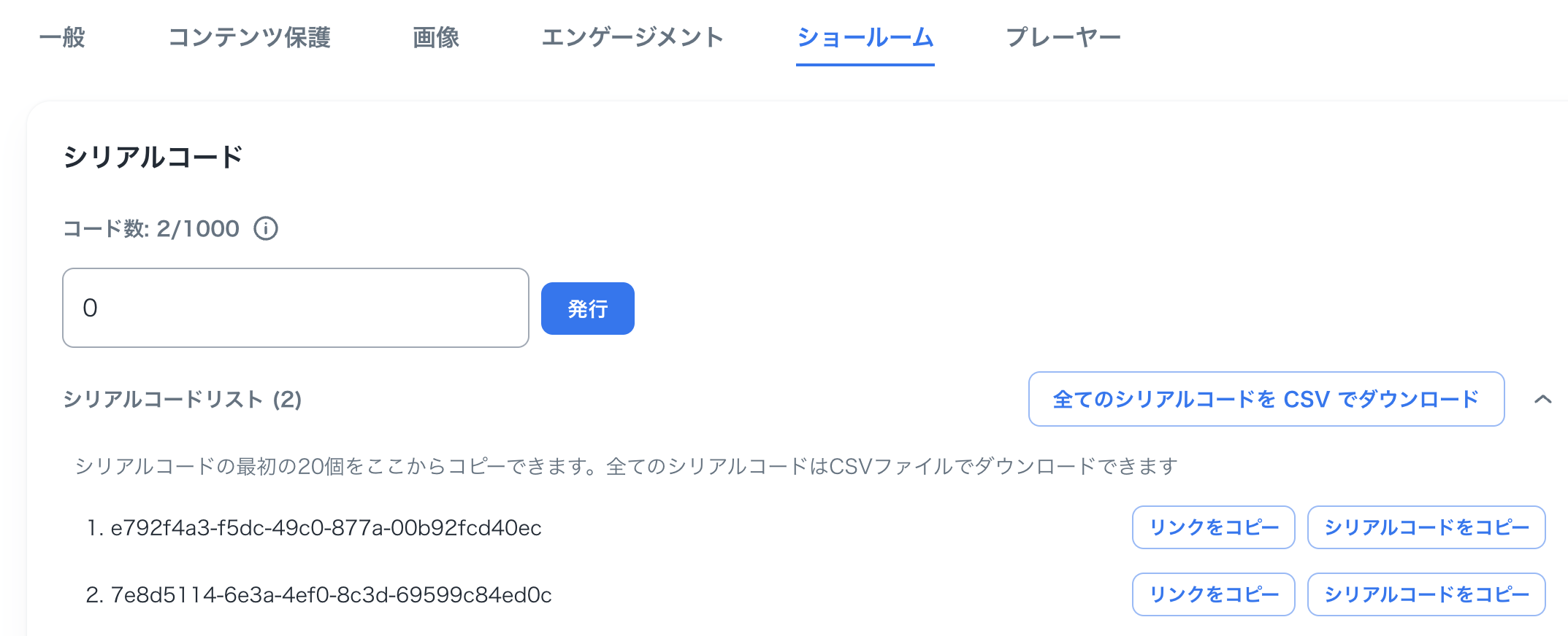 - 追加でシリアルコードを発行したい場合、追加したい数を入力し、再度「発行」をクリックすることで追加発行されます。合計発行数は「コード数」に表示されています。
