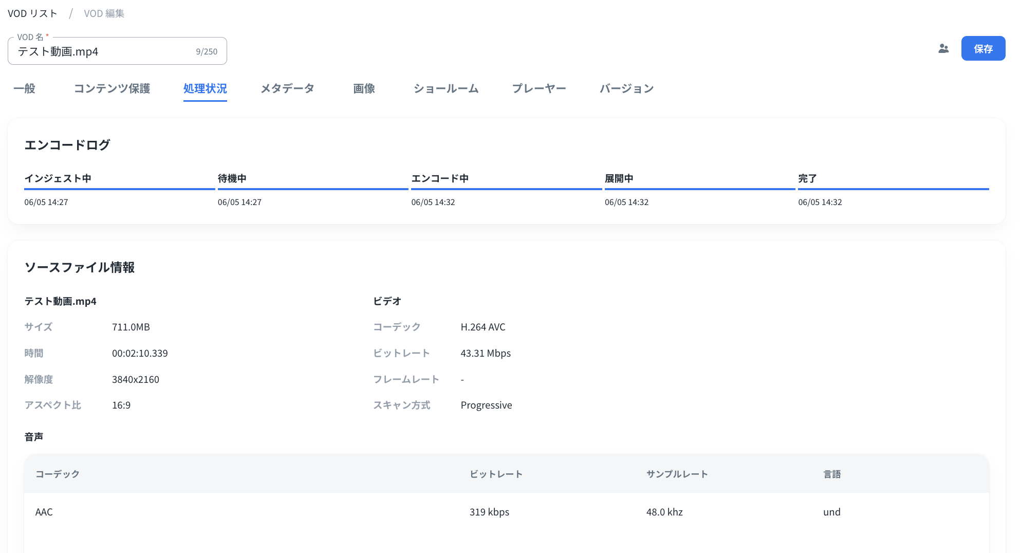 エンコード処理用にファイルがアップロードされると、各VODの編集画面でステータスと詳細を確認することができます。