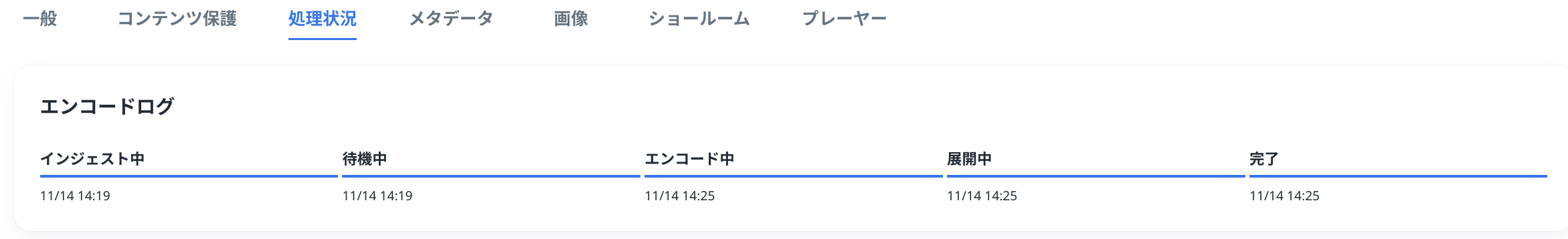 このセクションでは、各ステータスを完了のタイムスタンプとともに表示します。