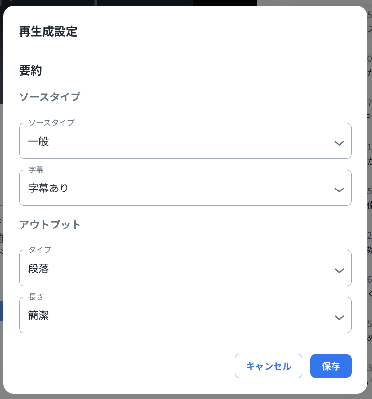 「再生成設定」画面が開きます。