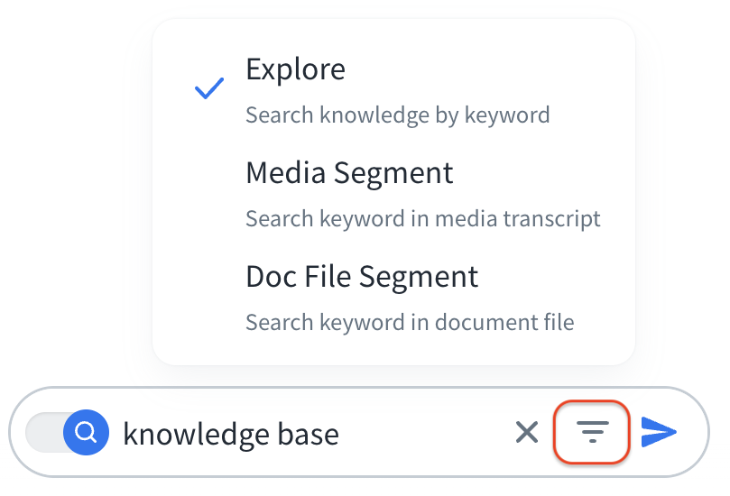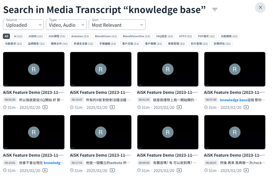 • Media Segment: Search keywords based on the media transcripts. The result will be displayed as media clips.
