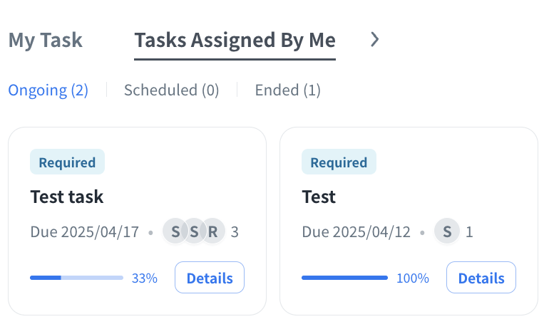 All the tasks you created will be listed on “Task Assigned By Me” tab on the left sidebar by the statuses Ongoing/Scheduled/Ended.