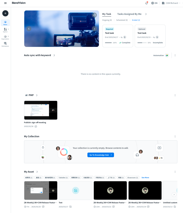 Upon the BlendVision AiM service, at the Home page on the left sidebar, you can confirm the information of carousel banners, tasks, spaces, the content collections and assets.