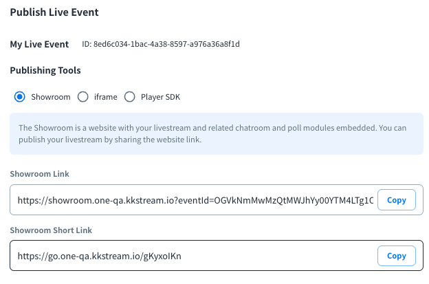 2. Find your Showroom URL via Livestream List -> Publish tool -> Showroom