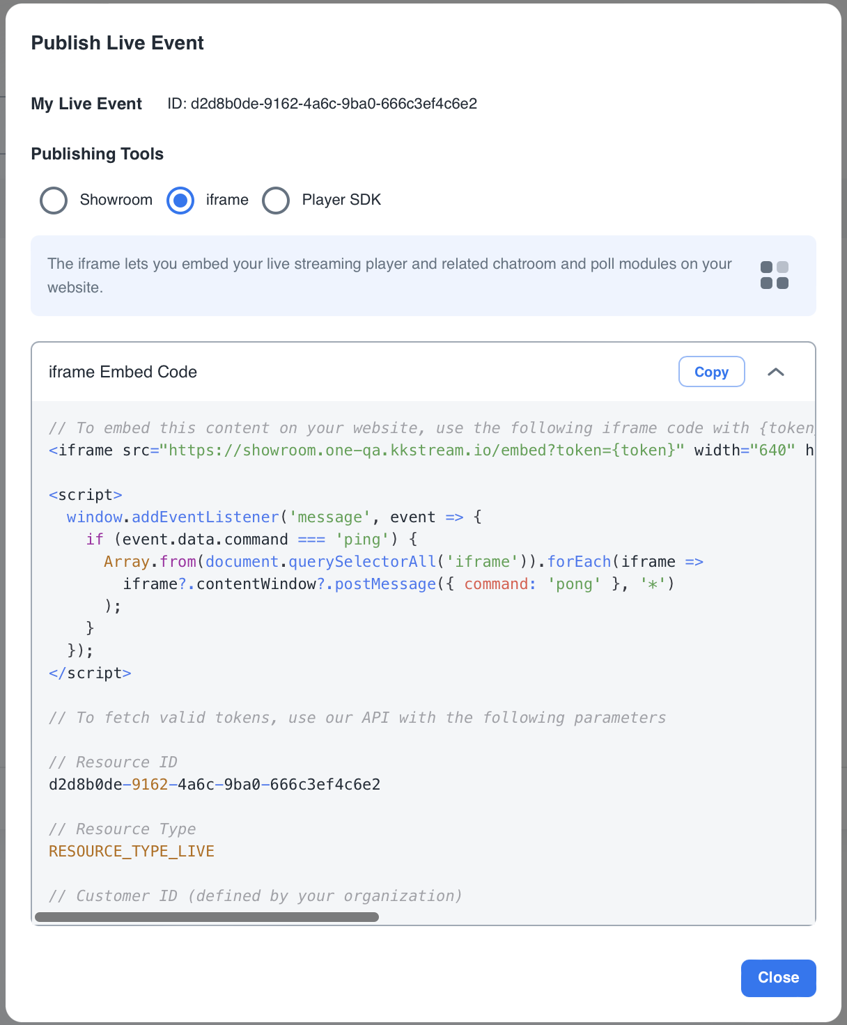 To publish your live event via the iframe player: