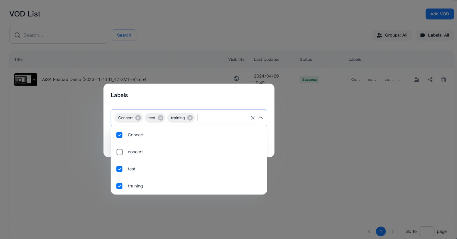 After you set up a new label to the VOD, click enter key and Save button to add one, where you can confirm on individual VOD in VOD list.
