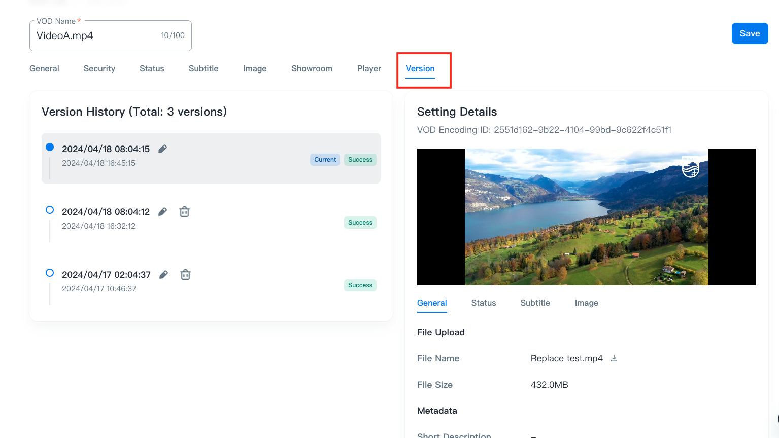 In the “Version” tab, you can confirm version history and the configurations of the VOD.