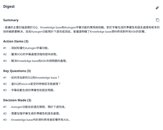 Action items, key questions and decision made will be displayed when “Meeting & Slides” is selected as source type.