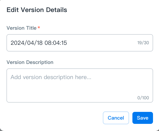 - Edit Versions Details:Click edit icon to edit the version with Version Title and Version Description