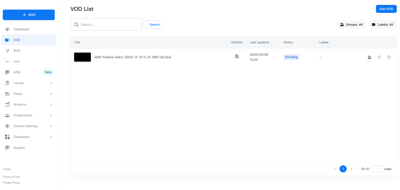 Once your file(s) are uploaded for encoding, you can confirm their status and details in the VOD list.