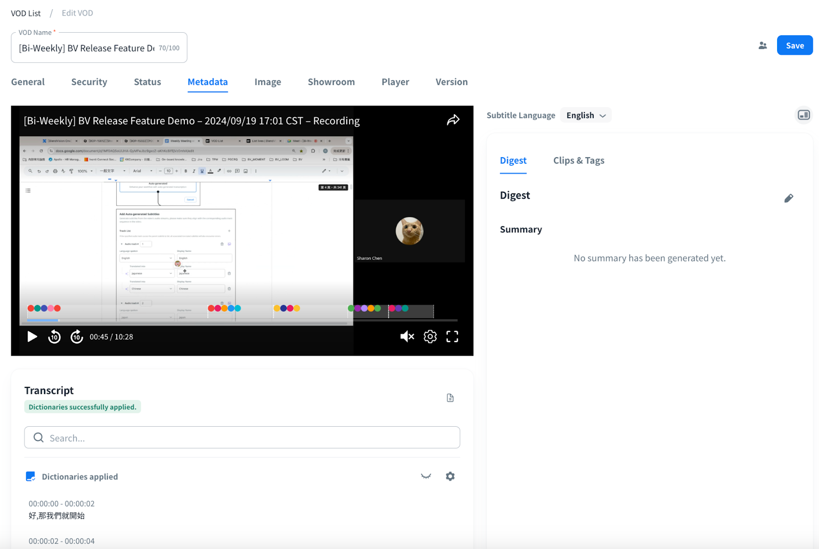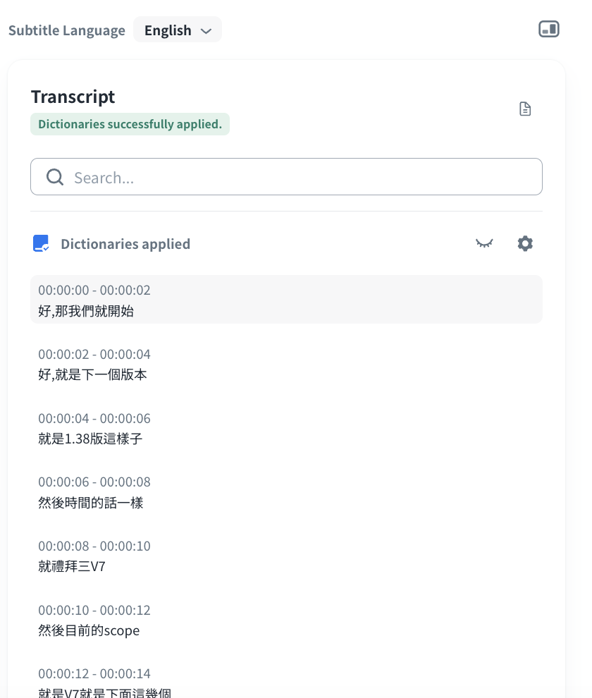 You can apply dictionaries to identify sensitive terms in VOD subtitles or transcription results at the stage of VOD creation and you can confirm the results under the Transcript section.