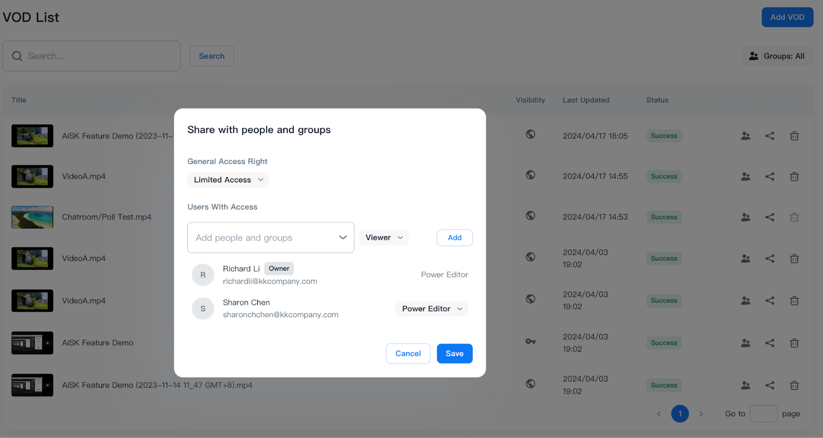 You can customize and share rights for each video from the VOD list.