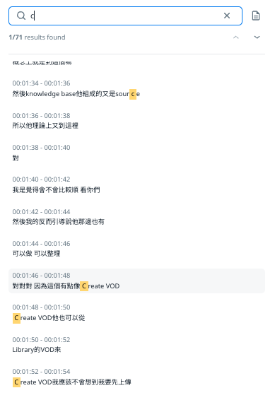 This feature allows users to find the clip information quickly where they can search the keyword within transcription and make the paragraph of transcription as a new clip.