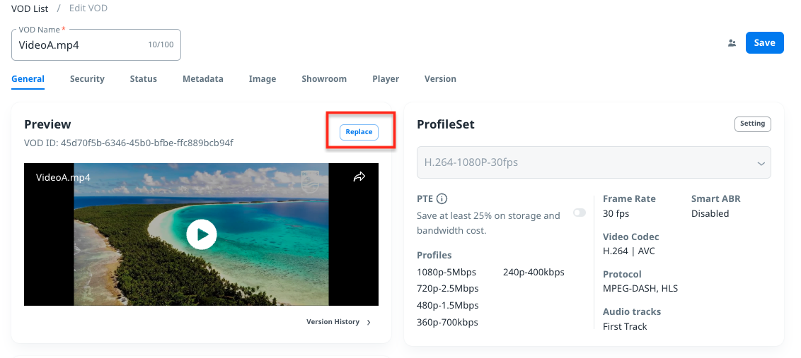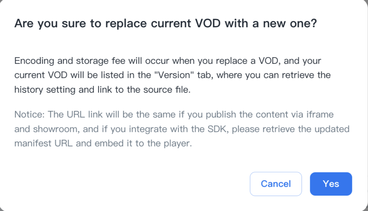 This feature allows users to replace the existing VOD to a new one without switching to a new VOD ID or URL. Therefore, it is more convenient and flexible to perform VOD replacement.