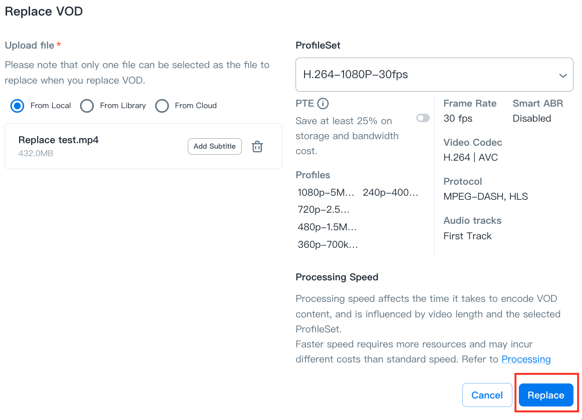 - Upload the file you want to replace from Local/Library/Cloud and set up the ProfileSet and Processing Speed.