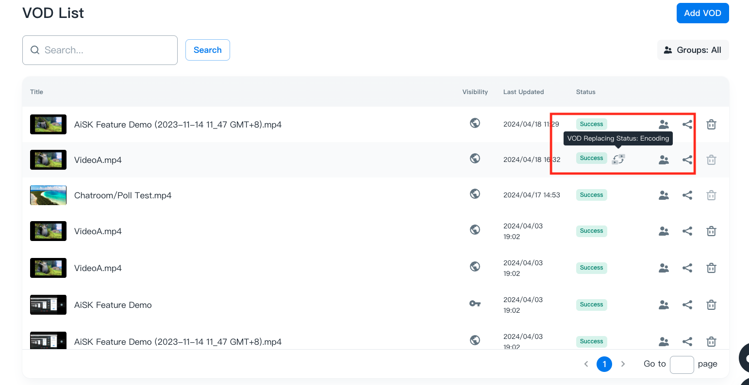- Return to VOD list, you can confirm the replacing status by hovering over the status of the video you want to replace.