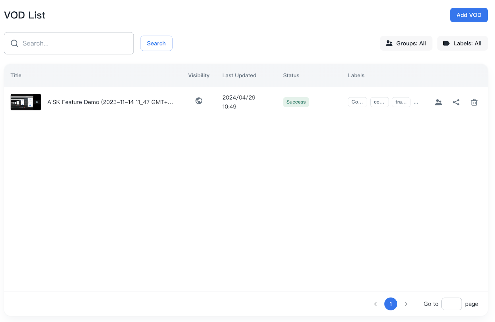 You can filter the VODs by labels from Labels: All bar at the upper-right side in VOD List.