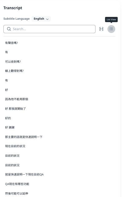 There are 2 display views for the transcription, Article View and List View. The default view is Article View where you can confirm the time range of each transcription.