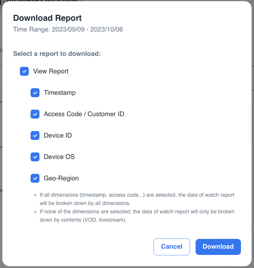 3. 彈出窗口將出現如下。您可以設定報告的開始/結束時間(針對 VOD),選擇您需要的維度,然後按下「下載」按鈕開始下載。
