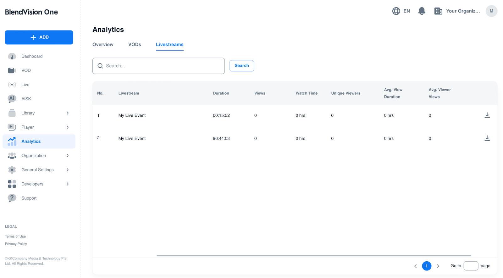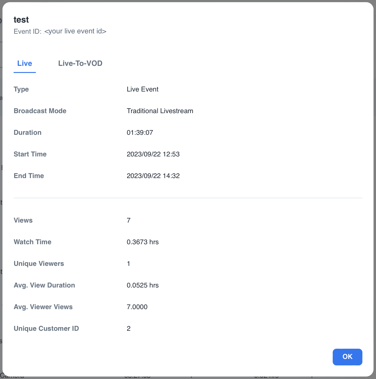 對於未啟用「Live-to-VOD」功能的活動,數值將顯示為「-」或「0」。