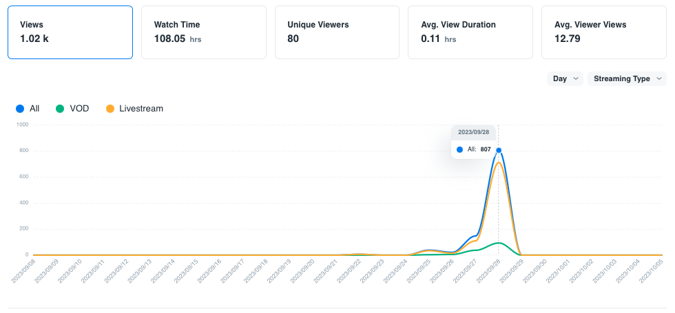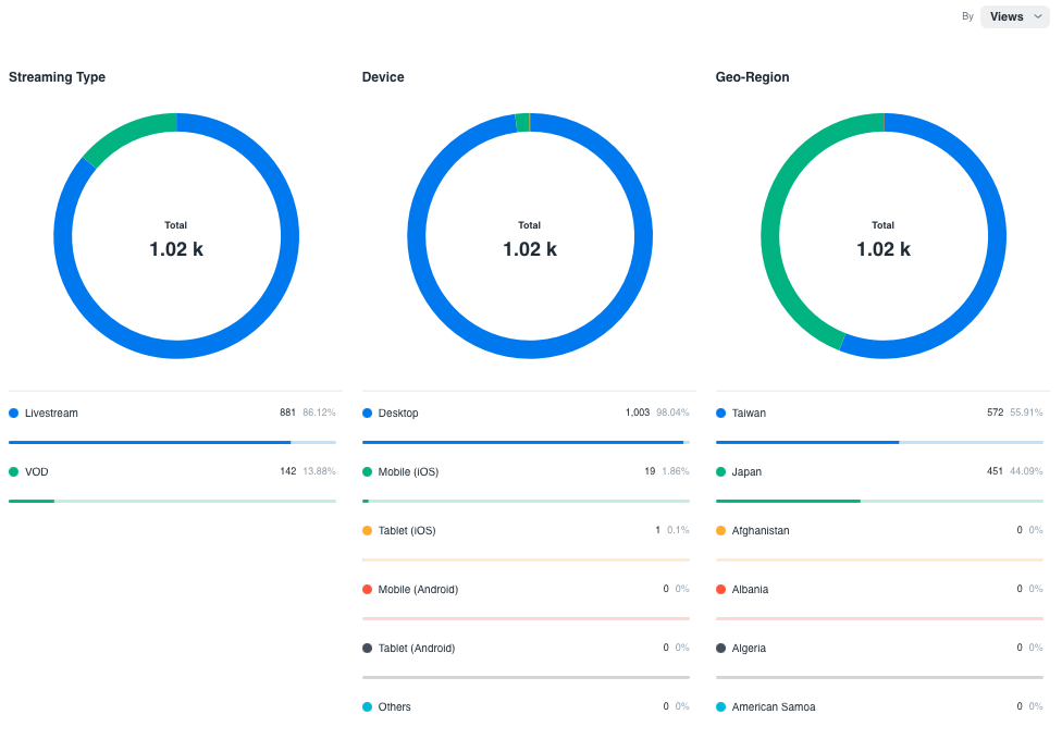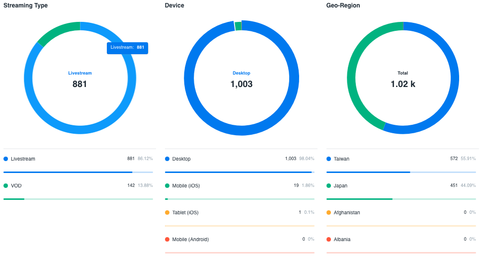 - 右側下拉選單可切換圖表類型:串流類型、裝置和地區。
