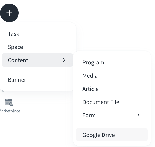 Click the “+” button on the left sidebar, and click Content to add a new content which can be connected with your Google Drive and choose an account to access the files.