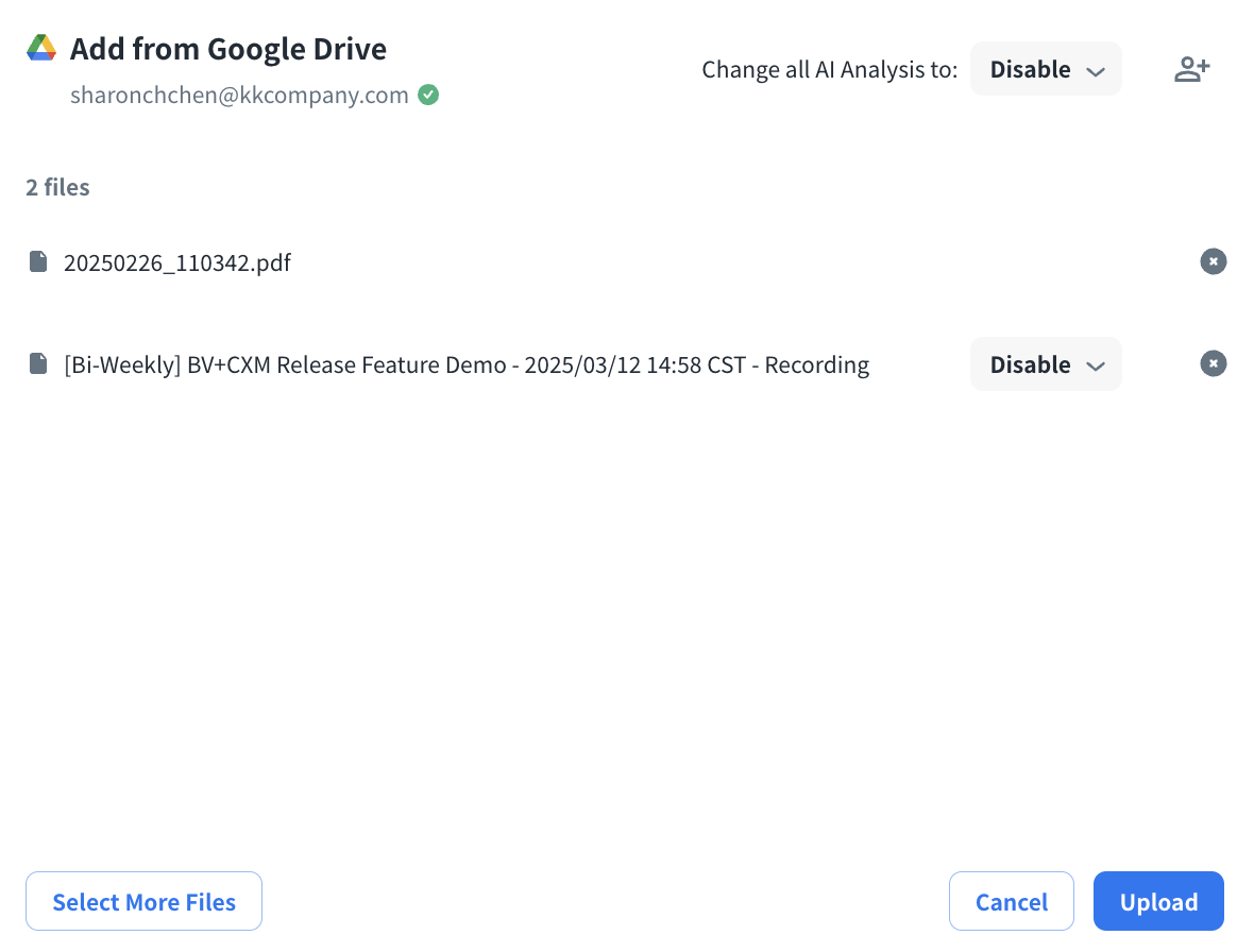 Click “Select More Files” to select the files to be uploaded and click Upload to add your files from Google Drive.