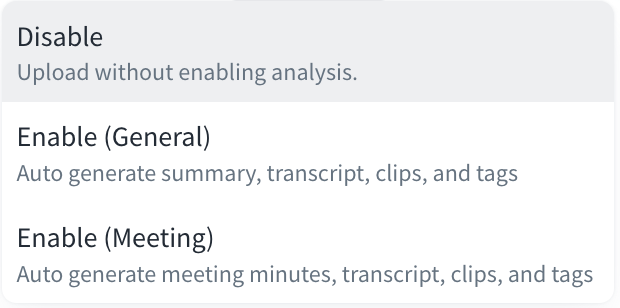 - Enable (General): Enable to auto generate summary, transcript, clips and tags