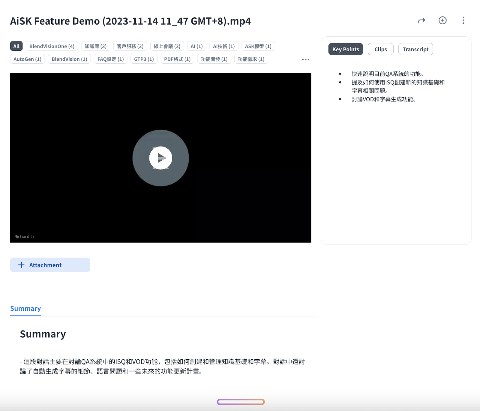 If your content is media and the setting of AI Analysis is enabled, the summary, transcript, clips and tags will be auto-generated and displayed on the content's detailed page once the content’s upload is completed.