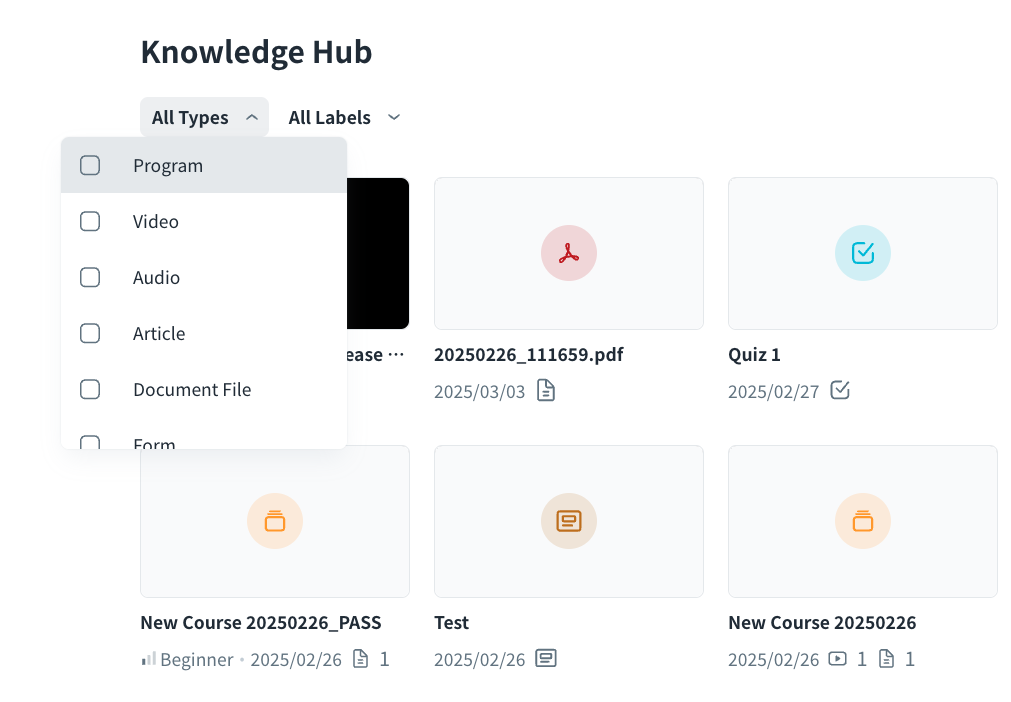You can filter the content by Types or Labels from the drop-down menu, and click the thumbnail to go to the detailed page of the content.