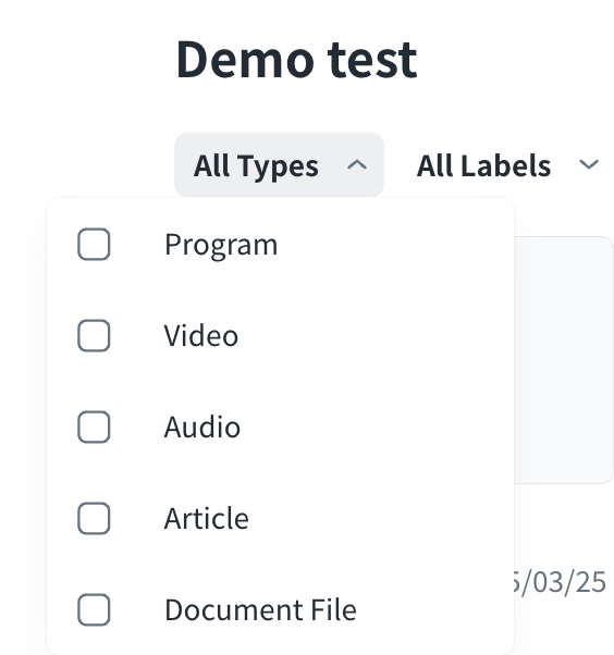 - Filter the content by Types or Labels from the drop-down menu, and click the thumbnail to go to the detailed page of the content.