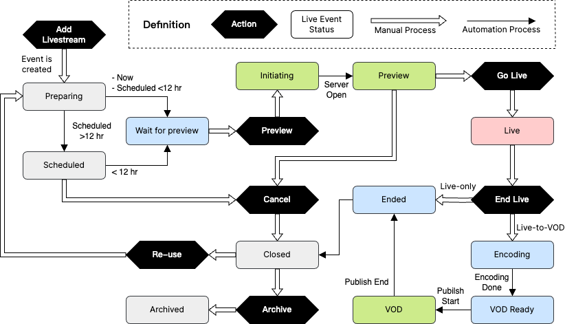 在創建直播活動後,您可以從直播列表中檢查和管理所有活動。要開始直播活動,您需要從控制室啟動開始程序。以下流程圖說明了直播事件的狀態轉換: