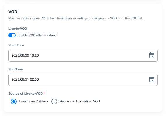 - **開始時間:**可以配置直播轉VOD的預定開始時間。