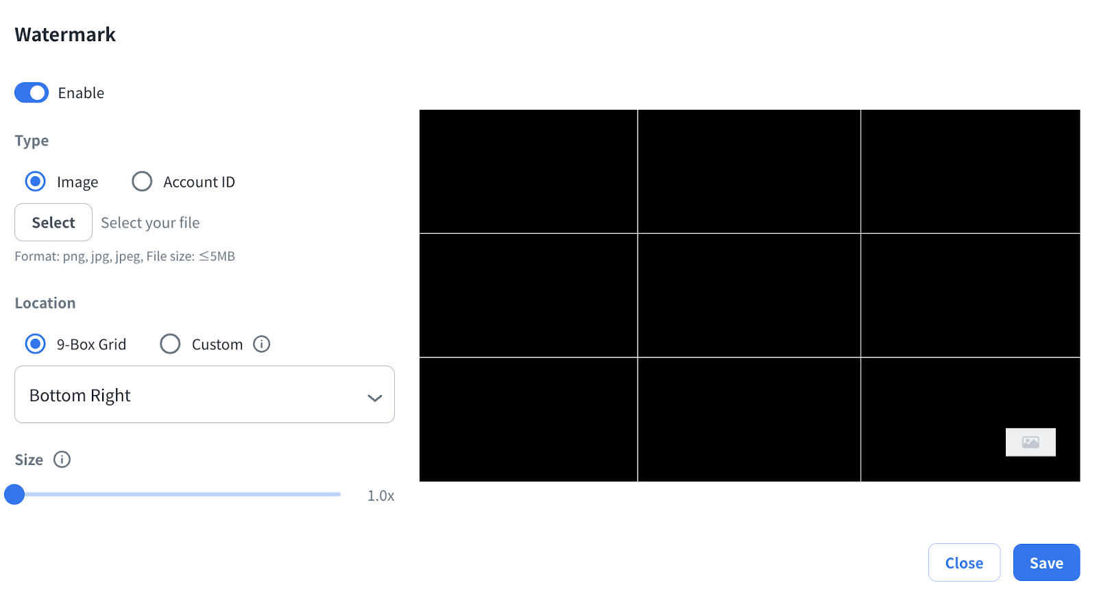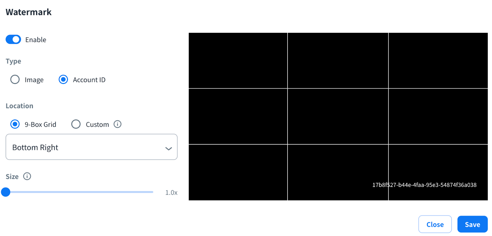Enable watermarking to claim the copyright or identify violators of pirated content. The audience will see the watermark overlaid on the videos in a designated spot during playback.